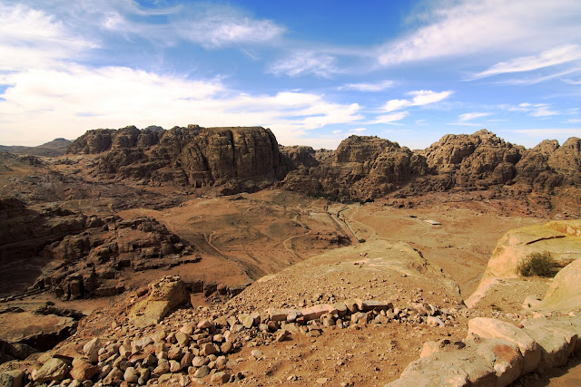 我小心翼翼的來到此高地,這是個高聳的懸崖,一不小心就是會跌落,這裡可千萬不能開玩笑在這個懸崖上可以很清楚看到這羅馬式的劇院,事實上這是Nabataean人在西元一世紀雕刻出來,可見Nanataean人深受羅馬文化影響甚深,在這劇院內可以容納約7000人